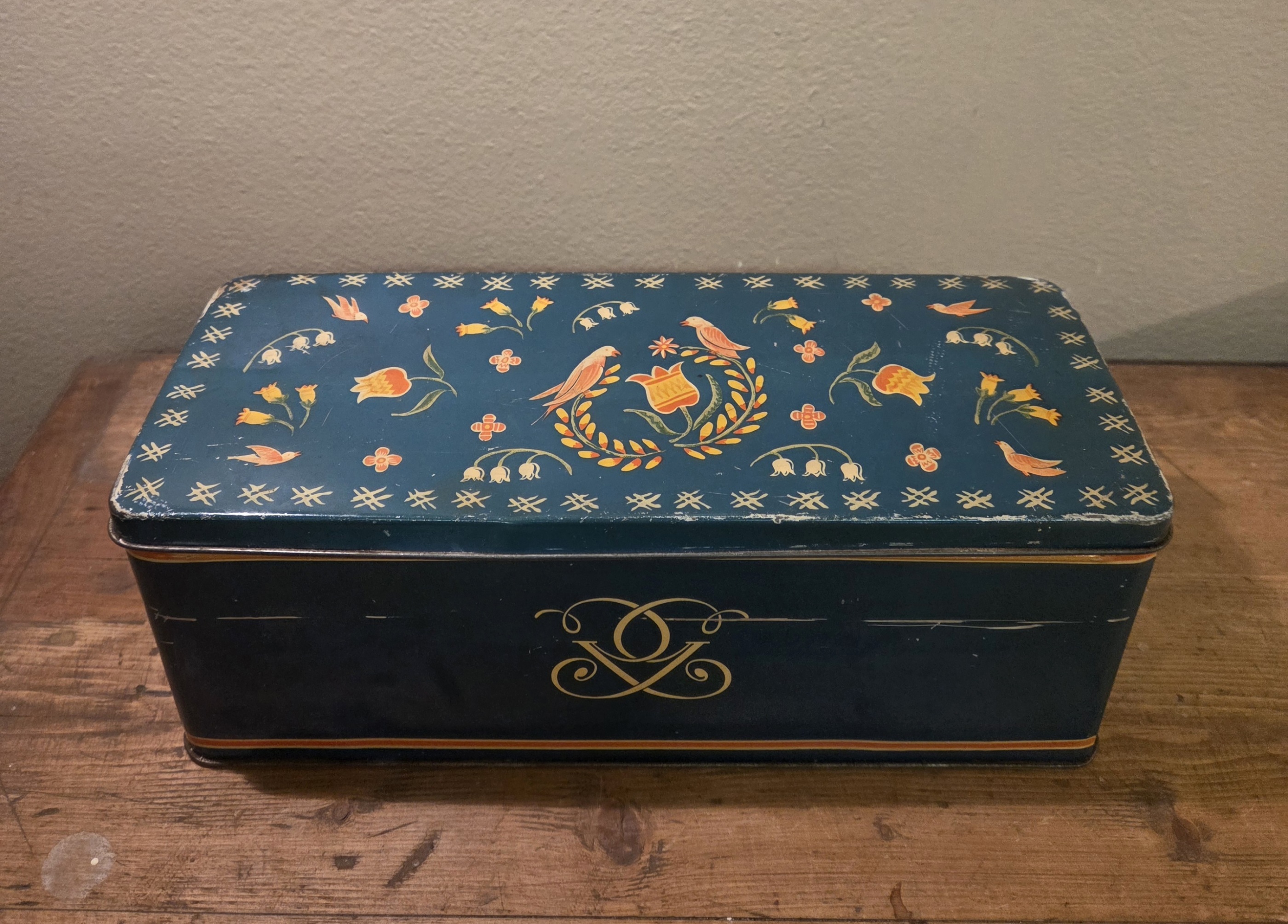 Rektangulär burk med 1800-talsmotiv. Längd 24 cm, bredd 17 cm, höjd 9 cm. Lite skavd runt om men ingen rost. 80 SEK