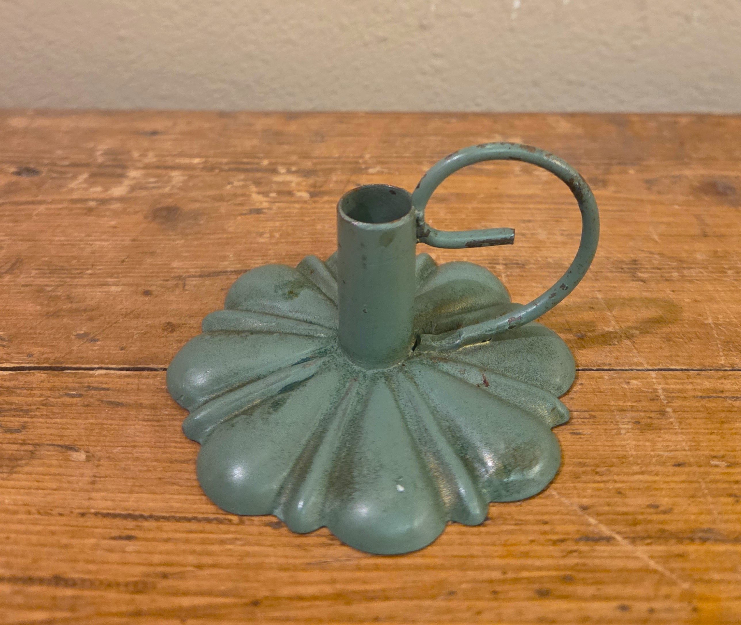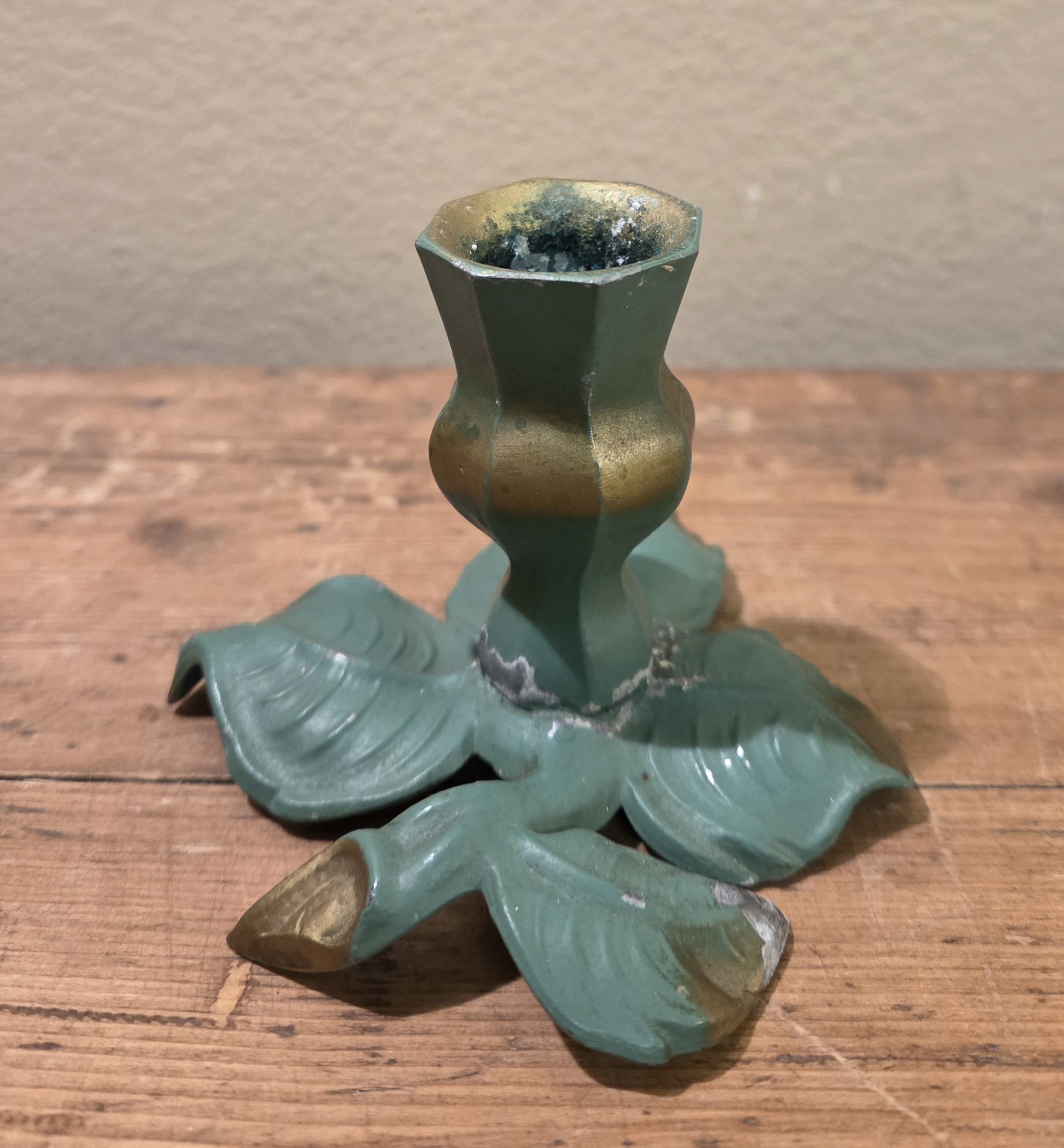 Liten grön ljusstake i metall för små smala ljus. Höjd (hänkel) 5 cm, diam. fot 7,5 cm. Fint skick. 25 SEK