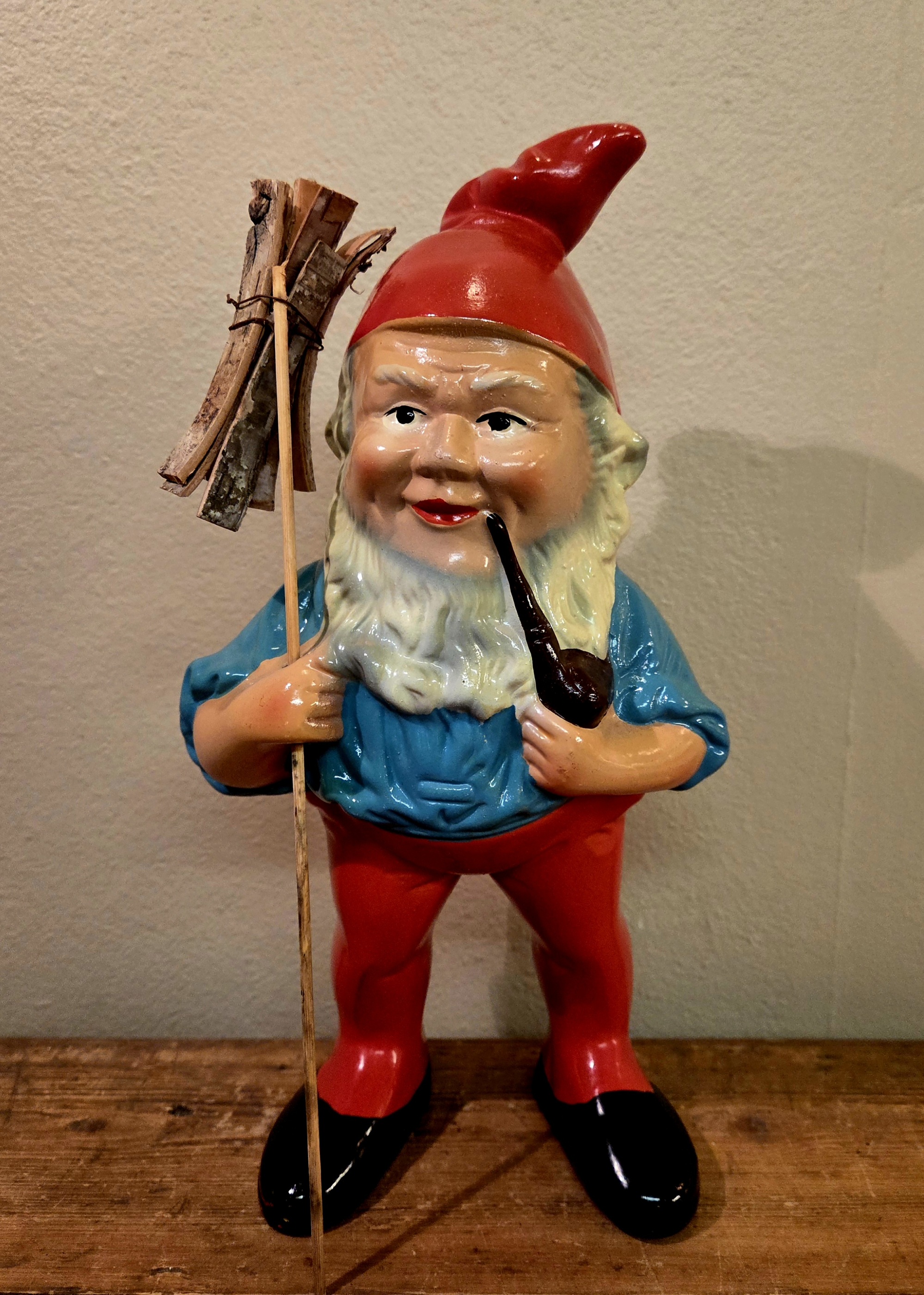 Stor stående tomte. Höjd ca 42 cm. Nagg på baksidan vid botten, annars gott skick. Nån har skrivit "Gekås 1988" i botten med blyerts. 190 SEK