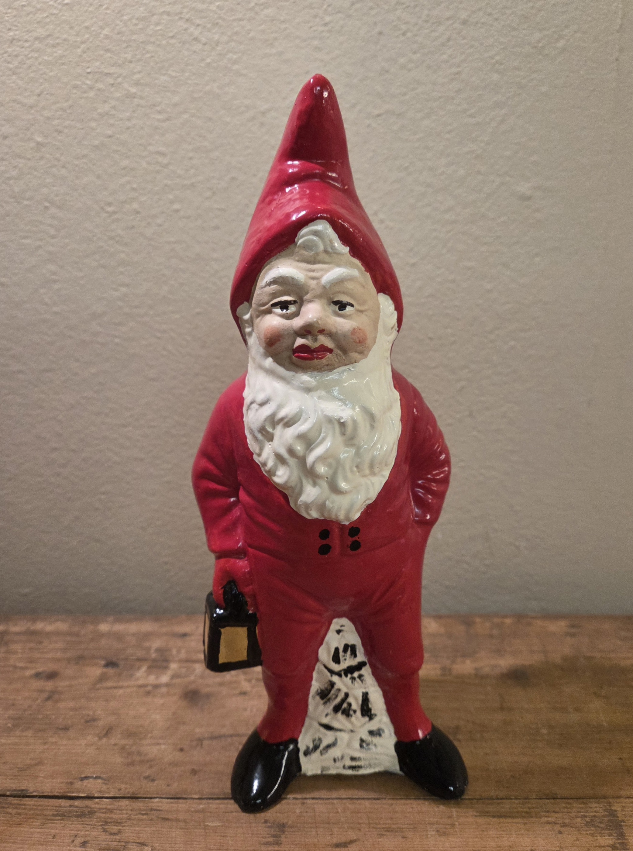 Stående gipstomte med lykta. Höjd 23,5 cm. Lite nagg/skav på lykta och fötter, annars gott skick. 65 SEK