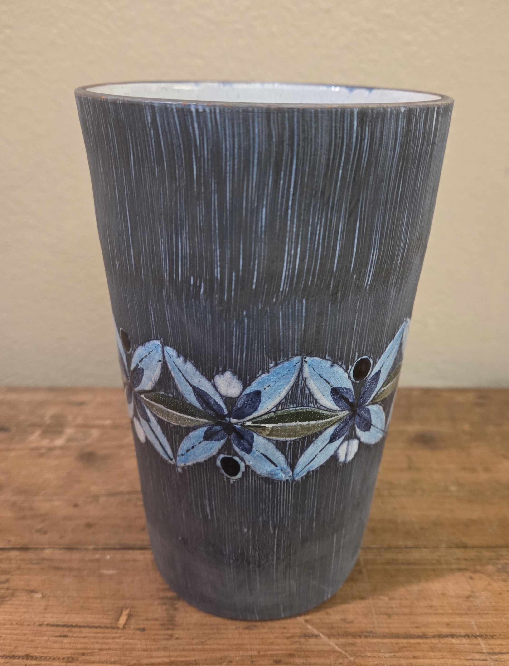 Rak gråblå vas med blommönster på mitten. Höjd ca 15 cm, diam. upptill 10 cm. Mininagg på kanten (ifärgad), annars gott skick. 75 SEK